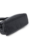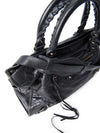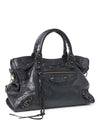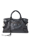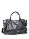 Guaranteed Authentic Balenciaga Vintage City Bag or 100% of your money back. This tote is crafted in distressed black lambskin leather with brass tone hardware. The bag features hand-stitched rolled leather top handles, a frontal zipper pocket, leather belts and patches, and black buckles and studs. The top zipper opens to a black fabric interior with a zippered pocket.