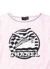 New with TagsGuaranteed Authentic Chanel La Pausa or 100% of your money back. This top is in 100% cotton terrycloth with pink and white stripes. It features a large Chanel cruise design with a CC logo and black trim along a bateau neckline and the sleeves. This is apart of one of Karl Lagerfeld's last collections. The perfect top for Chanel lovers this summer!