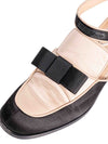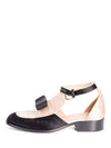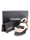 Guaranteed Authentic Chanel Cut-Out Oxfords or 100% of your money back. These shoes are in black and beige satin featuring a black bow. Its low block heel has a CC logo and an accompanying black ankle strap. This shoe was seen in different color ways on the Chanel Spring 2015 RTW Runway Show.