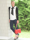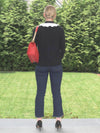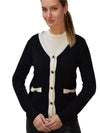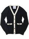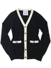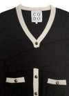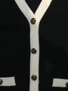 This cardigan is in 100% black cashmere with white piping, featuring signature CODO buttons and two front pockets. It will keep you warm and elegantly dressed all fall (and winter) long.
