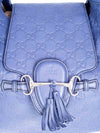 Very GoodGuaranteed Authentic Gucci Leather GG Supreme Jackie-O Hobo Bag or 100% of your money back. This Gucci bag is in blue leather with GG Supreme embossed throughout. It features silver hardware, a top flap closure, horse-bit buckle accents, and a tan interior canvas with one zip pocket.