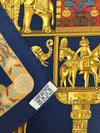 Guaranteed Authentic Hermes Silk "Torana" Scarf or 100% of your money back. This Hermes scarf is in gold, royal blue and red colors and features signed Hermes Paris and hand-rolled edges.