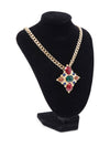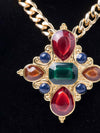 Guaranteed Authentic Jay Strongwater Gripoix Necklace or 100% of your money back. This 24K gold plated necklace features a Gripoix pendant with the emerald, sapphire, amber and ruby cabochon glass stones. The back of the pendant is signed "Jay Stronwater".