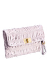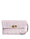 Very GoodGuaranteed Authentic Prada Gaufre Clutch or 100% of your money back. This bag is in taupe leather with gold hardware. It features a turn lock closure, a removable wristlet strap, and a fabric interior.