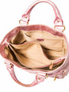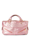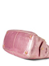 Guaranteed Authentic Celine Logo Shimmer Leather Top Handle Boogie Bag or 100% of your money back. This bag is in shimmery pink leather featuring gold tone logo embossed hardware. This bag opens to suede lined interior with one large zippered pocket and one slip pocket. The bag features two top handles and two side snap pockets.