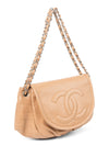 Very GoodGuaranteed Authentic CHANEL CC Logo Caviar Leather Half Moon Bag or 100% of your money back. This CHANEL bag is in beige caviar leather featuring jumbo CC logo on the front flap, quilted side panels and silver tone hardware. This bag comes with signature CHANEL dual chain strap. It opens with a magnetic snap closure to a beige canvas lined interior featuring one patch pocket and one zippered pocket.