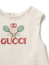 Like NewGuaranteed Authentic Gucci dress or 100% of your money back. This dress is in ivory cotton knit fabric, showcasing an embroidered Gucci logo with tennis inspired artwork. The dress features sleeveless silhouette, a pleated bottom, and a rear zipper closure.