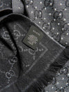 Like NewGuaranteed Authentic Gucci Scarf or 100% of your money back. This scarf is in charcoal grey 100% wool and features GG supreme monogram print with fringed edges and silver tone studs.