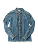 Like NewGuaranteed Authentic Gucci Denim Shirt or 100% of your money back. This Gucci top is in medium wash blue denim with denim ruffle embellishments and dark pearl Gucci buttons.