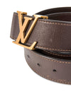 Very GoodGuaranteed Authentic Louis Vuitton Logo Leather Belt or 100% of your money back. This Louis Vuitton belt is crafted in brown leather featuring gold tone LV buckle logo.