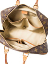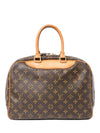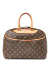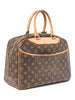Very GoodGuaranteed Authentic Louis Vuitton Deauville Bag or 100% of your money back. This bag is in signature brown Louis Vuitton monogram/vachetta leather combo with gold-tone hardware. It features a full frontal exterior pocket, rolled leather top handles, and a LV zipper lock charm. The top zipper closure opens to large storage with 4 patch pockets and four elastic band holders.