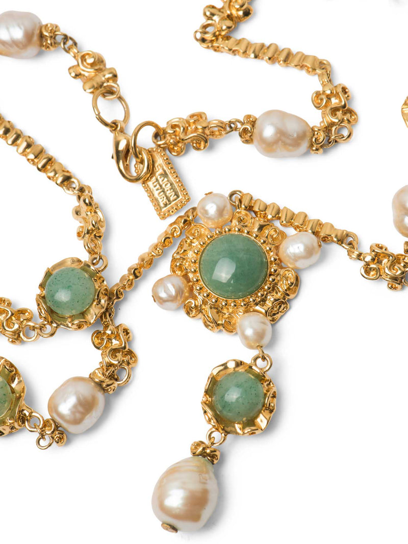 Like NewGuaranteed Authentic St. John Necklace or 100% of your money back. This stunning gold plated necklace features a regal design made up of green cabochon stones & ivory faux pearls. The pendant also showcases a dangling embellishment.