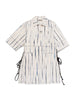 Very GoodGuaranteed Authentic Tory Burch Denim Dress or 100% of your money back. This dress is in white washed denim fabric with dark blue stripes and silver tone hardware. It features a front button closure, two front pockets, and drawstrings on the side to customize the fit.