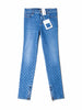 New with TagsGuaranteed Authentic CHANEL stretchy denim jeans or 100% of your money back. These Chanel jeans are in medium wash denim with a gold tone CC logo button. It features a diamond cross light wash pattern, two pairs of pockets in front and back, and leg opening zippers.