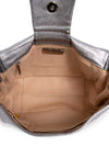 Very GoodGuaranteed Authentic Chanel Chain Around Flap Bag or 100% of your money back. This Chanel bag is in metallic leather with prominent silver-tone hardware. It features the signature CC logo on the front, chain around detailing, and a double leather woven silver chain. It opens up to a beige leather interior with one interior zip pocket and two slip pockets.