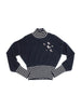 Guaranteed Authentic Chanel Airplane Turtle Neck Sweater or 100% of your money back. This Chanel sweater is crafted in navy cashmere silk blend fabric knit with white knitted accents. It features an oversized cropped silhouette with a turtle neck collar and Chanel Airplane badge embellishments.