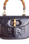 Guaranteed Authentic Gucci Crocodile Bamboo Top Handle Bag or 100% of your money back. This iconic Gucci bag is in genuine shiny crocodile with a bamboo top handle, bamboo turn-lock closure at front, and a tonal leather interior with one zipped pocket. This elegant, highly collectable Gucci bag also has gold-tone hardware links for a long strap.