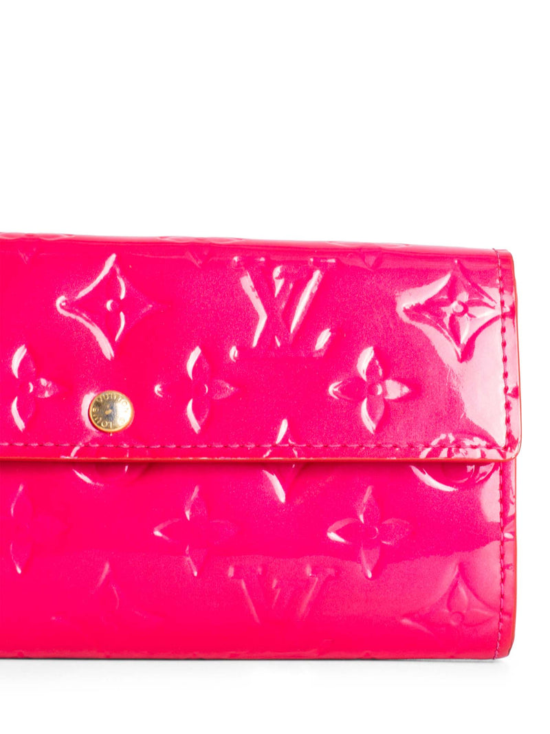 Very GoodGuaranteed Authentic Louis Vuitton Monogram Vernis Patent Leather Wallet or 100% of your money back. This super stylish 2008 LV wallet is in hot pink patent leather and features a front snap closure. It opens to four card slots above the closure and the interior contains a zip large pocket with a coin bank and 2 similar sized pockets surrounding for extra storage. The back contains six card slots and another pocket for cash.