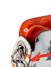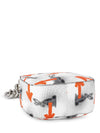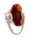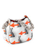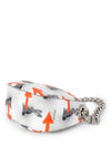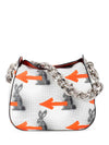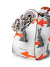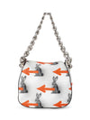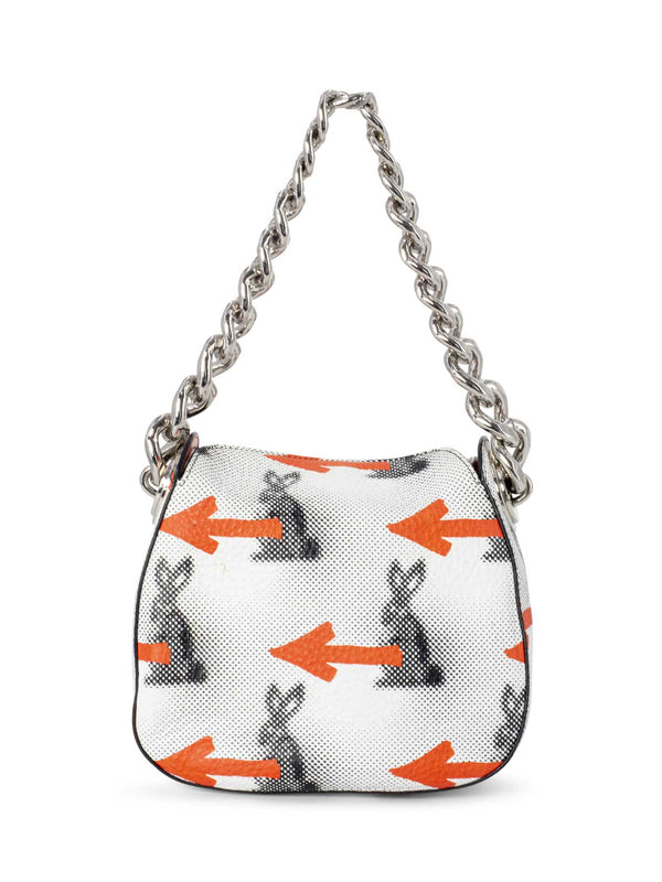 Guaranteed Authentic Prada Bag or 100% of your money back. This gorgeous limited addition Prada bag is in white, orange, and black leather. It features designs of a black rabbit, orange arrows, and black specks throughout the bag. The interior opens up to one zippered pocket and orange leather lining. The bag comes in silver tone hardware and a chunky silver chain to wear as a shoulder bag. It is chic, edgy, and in excellent condition.