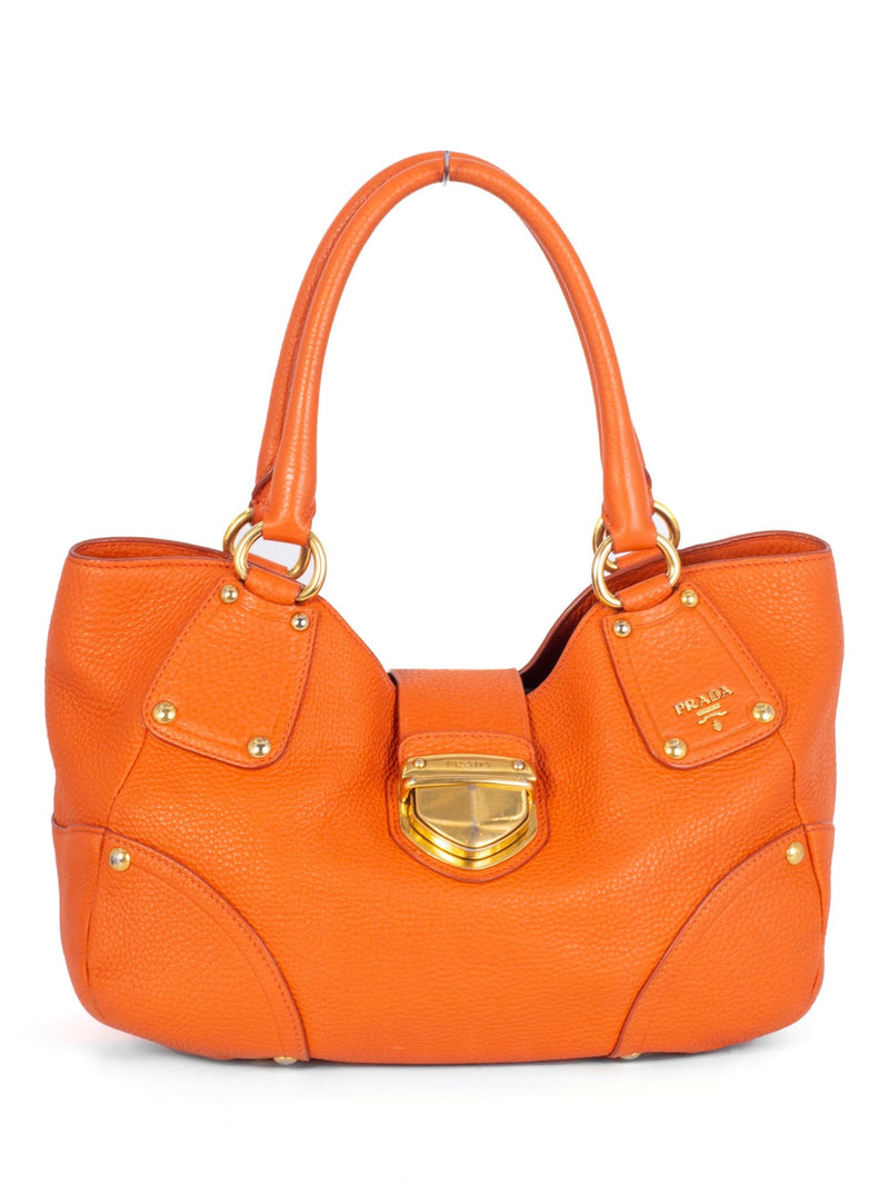 Very GoodGuaranteed Authentic Prada Shoulder Bag or 100% of your money back. This bag is in orange pebbled leather, featuring rolled leather top handles, gold tone hardware, a buckle for closure. It is lined in orange Prada jacquard monogram fabric with a zipper pocket and patch pocket.