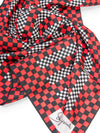 Guaranteed Authentic Schiaparelli Logo Checkered Scarf or 100% of your money back. This Schiaparelli scarf is in silk and rayon blend featuring checkered pattern in red, black and white. It has a Schiaparelli logo on the corner. Flag is attached.